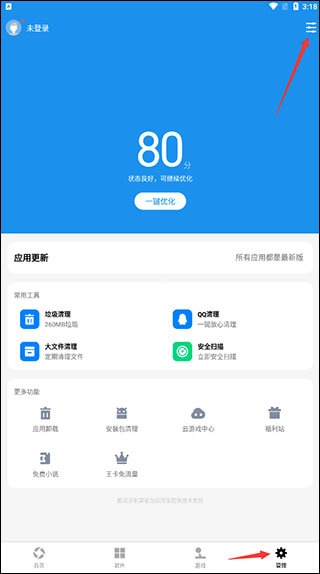 2. 进入应用宝程序的主界面后,点击管理页面,进而进入设置菜单。