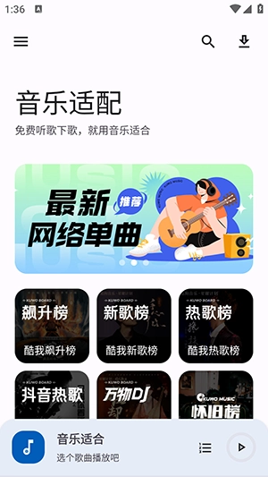 音乐适合是一款极其火爆的音乐播放器,它整合了全网所有热门的歌曲资源,用户随时随地都能畅享听歌的美妙体验。其智能推荐功能十分贴心,能让用户轻松发掘自己感兴趣的歌曲。而且,只要安装这款播放器,就能免费听歌,快来试试吧!