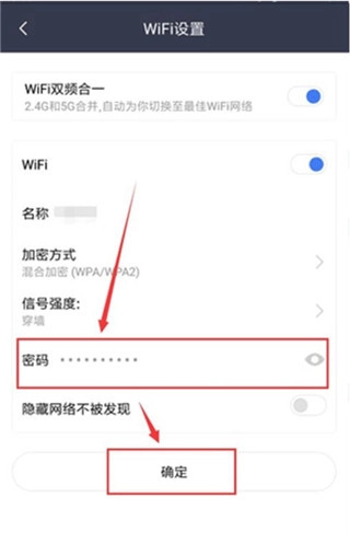 3、进入“wifi设置”页面,在其中找到“密码”选项,输入新的WiFi密码,接着点击页面下方的“确定”按钮,这样就能重新设置wifi密码了。
