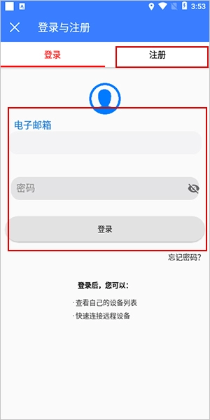 1、安装完成后,先进行账号注册,随后登录手机远程协助控制,在软件首页查看已连接过的设备列表。