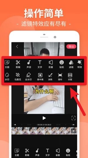 3、剪辑页面中提供丰富编辑按钮,可添加滤镜、特效、文字、水印、马赛克等实用编辑选项。