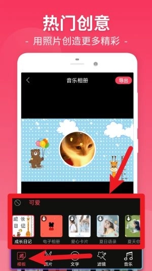 4、进入“音乐相册”创作区,选择预设模板如成长日记、爱心卡片,即可快速制作专属相册视频。