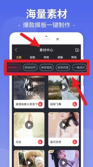 2、在“素材中心”中挑选热门模板,涵盖神奇美拍、特效创作等多样风格,支持一键成片功能。