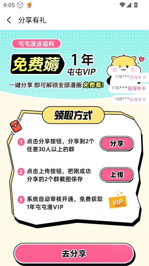 4、完成指定任务后,即可领取长达一年的屯屯漫VIP会员权益,畅享无限制阅读体验。