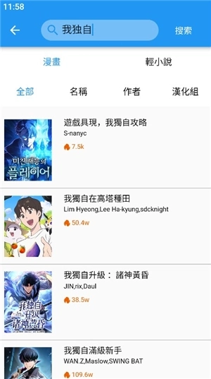 2、在这里你可以检索各类漫画、小说作品,或者直接搜作者或汉化组
