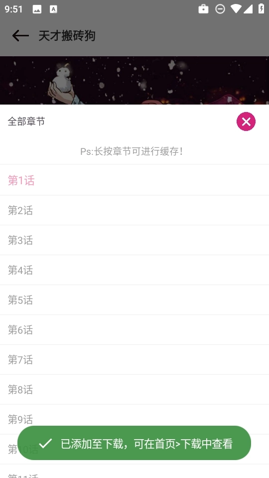 第五步:稍等片刻,屏幕上方就会出现“已加入缓存”的提示,表示该章节已成功保存至本地,无需联网也可随时阅读,出行、通勤、断网都不再是问题!