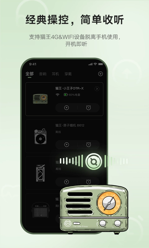 -【设备智能联控】猫王4G&WIFI设备无需依赖手机,开机就能直接收听;能够同时连接多台猫王音响,随时查看各设备的电量情况,此外还具备对设备设置定时休眠和定时唤醒的功能