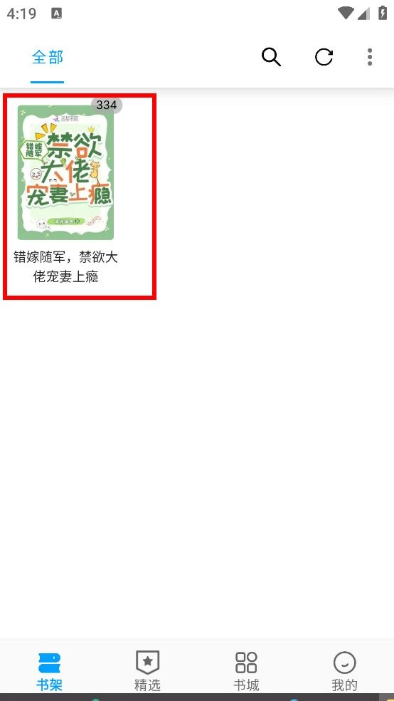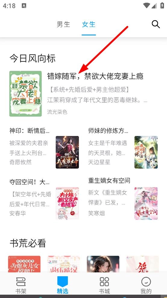 在精选页面,点击目标书籍(例如《错嫁随军,禁欲大佬宠妻上瘾》),即可进入书籍信息页面。
