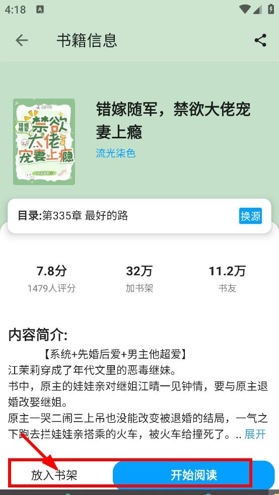 在书籍信息页面,你可以点击“放入书架”或“开始阅读”按钮来执行对应的操作。