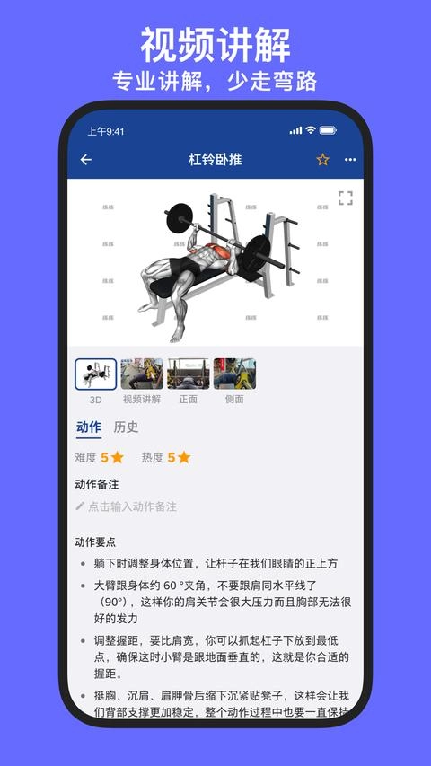 2.300+动作,配有视频演示、文字说明,不用去健身房请私教也能轻松学会如何训练。