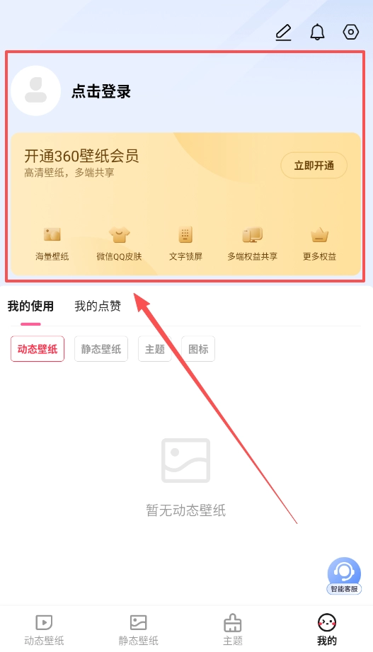 首先点击登录并开通360壁纸会员,开通后可享受高清壁纸多端共享的权益,随后浏览海量壁纸库。