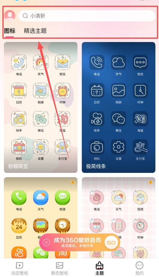 3、更换图标时,先进入精选主题页面,浏览粉桶萌豆、极简线条等风格的主题,然后挑选电话、日历等应用对应的图标套装。
