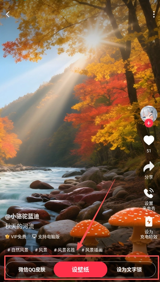 当遇到心仪的壁纸(比如秋天的河流这类),你可以把它设置成手机壁纸、来电秀或者充电特效;电脑端的用户还能同步用上同款壁纸。