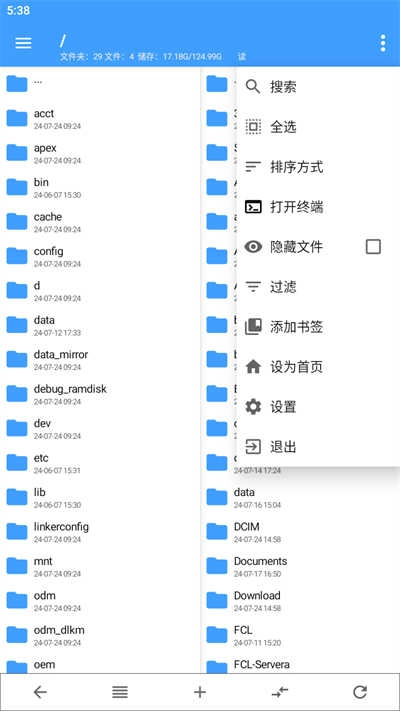3、点击左上角的菜单选项可以查看更多的功能,还可以切换根目录和内部存储,让你快速找到文件;Space