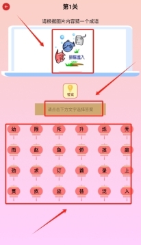 3、要是想玩,直接点击游戏入口。以看图猜成语为例,根据图片进行猜测,将下方的汉字按顺序填入框中即可。