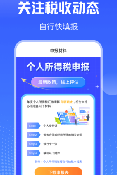 个人所得税申报是一款专为个税申报打造的应用,它能助您更便捷地算出应缴纳的税费,还支持申请退税,堪称便捷的税收计算器。无论是个人所得税、工薪税,还是年终税等各类税收,都能精准计算。而且,该应用可依据您所在地区,智能调整相关比例,既省时又省心。它功能丰富多样,性能强大,使用起来方便快捷,能实现快速、精准报税。您是否想知道每月缴纳了多少个人所得税?在新规个税政策下,是否纠结需补税还是退税?一键在线评估,就能轻松帮您解决个税难题。有需要的用户均可免费使用。