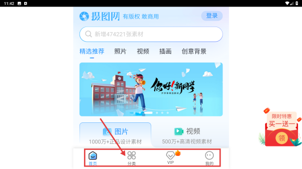 1. 打开摄图网,点击页面底部的分类选项,浏览素材分类相关页面。