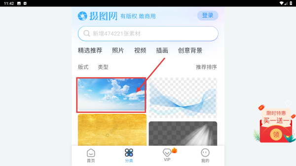 2. 在分类页面,挑选诸如天空云朵背景图这类目标素材,随后进入素材详情页面。