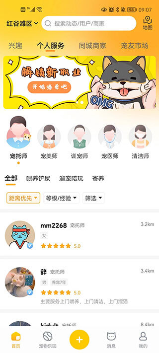 3. 涵盖宠物领养(猫咪领养、狗狗领养)、借配,以及宠物服务(上门喂猫、上门铲屎、寄养)与养宠知识板块。2、宠友可从专业服务者及优质商家所提供的各类养宠服务中进行挑选。
