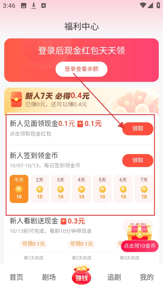 在福利中心里,可以看到新人专属福利,比如新人见面就能领现金、新人每日签到可领金币之类的,只要点击对应的【领取】按钮就能完成领取啦。