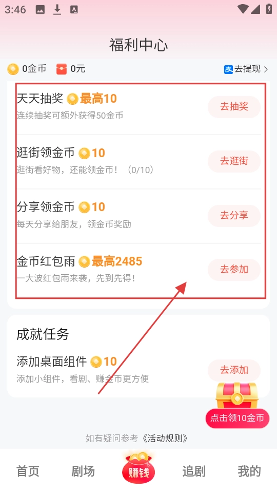 要是想参加赚钱活动,得先点击页面底部的【赚钱】按钮,进入福利中心,这里能领取各种各样的福利哦。
