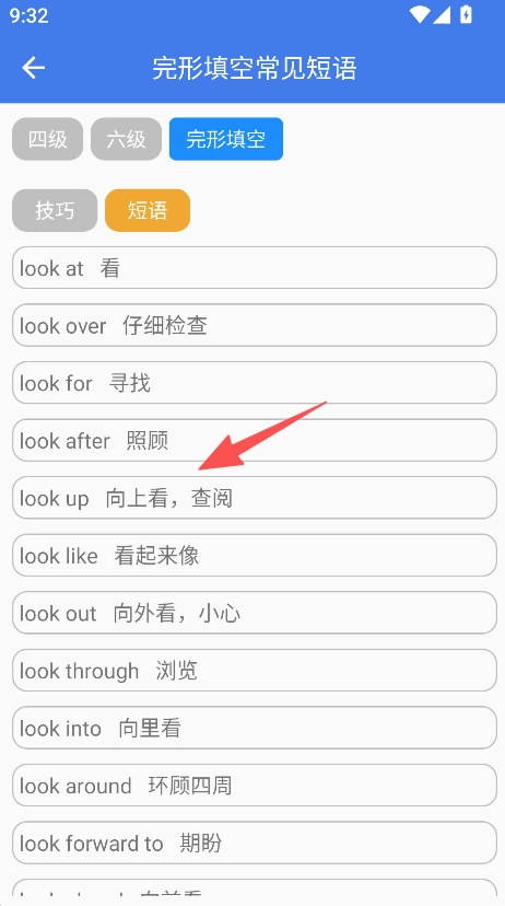 短语列表内容详实,常见短语按类别进行整理,像look相关的短语就归为一类,便于学习者集中记忆,提升短语积累的效率。