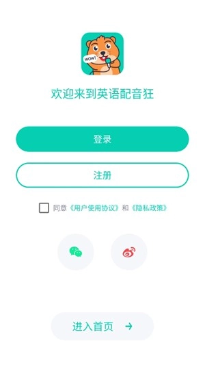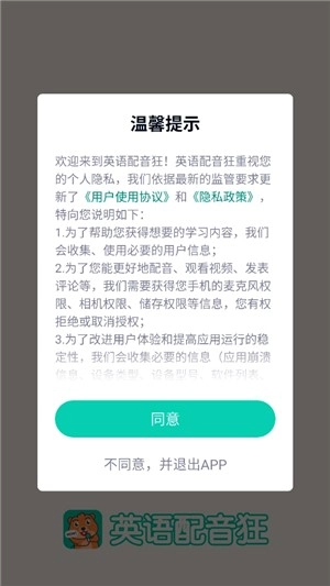 安装英语配音狂,之后打开并同意隐私政策