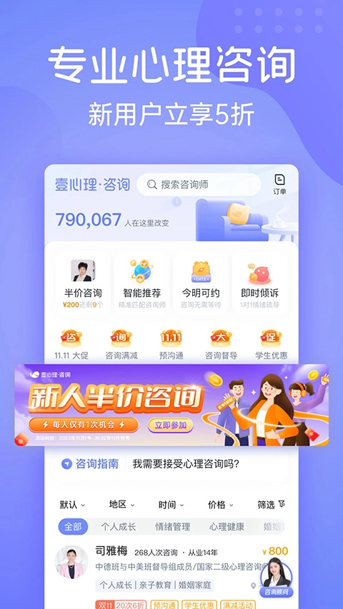 快速匹配,智能筛选,为您找到可靠的心理咨询师,通过网上支付、预约,可以实现一对一的语音、视频或见面咨询服务。