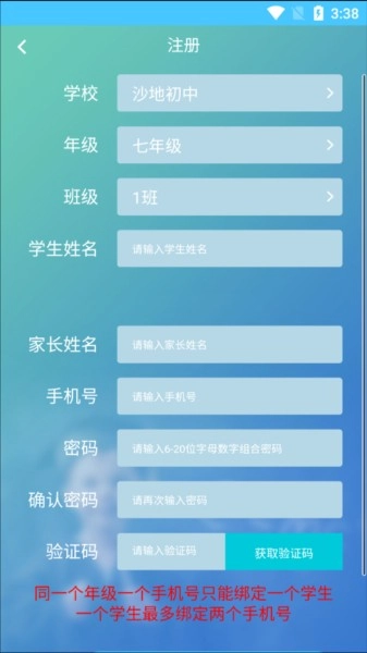 注意:同一年级一个手机号只能绑定一个学生,一个学生最多绑定两个手机号。