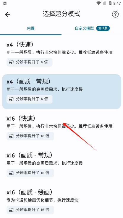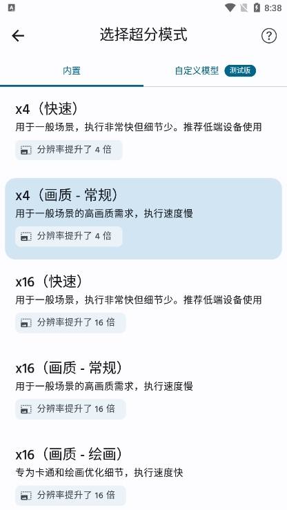 3. 可在x4(快速模式)、x4(常规画质模式)、x16(快速模式)、x16(常规画质模式)、x16(绘画画质模式)之间进行自由切换。