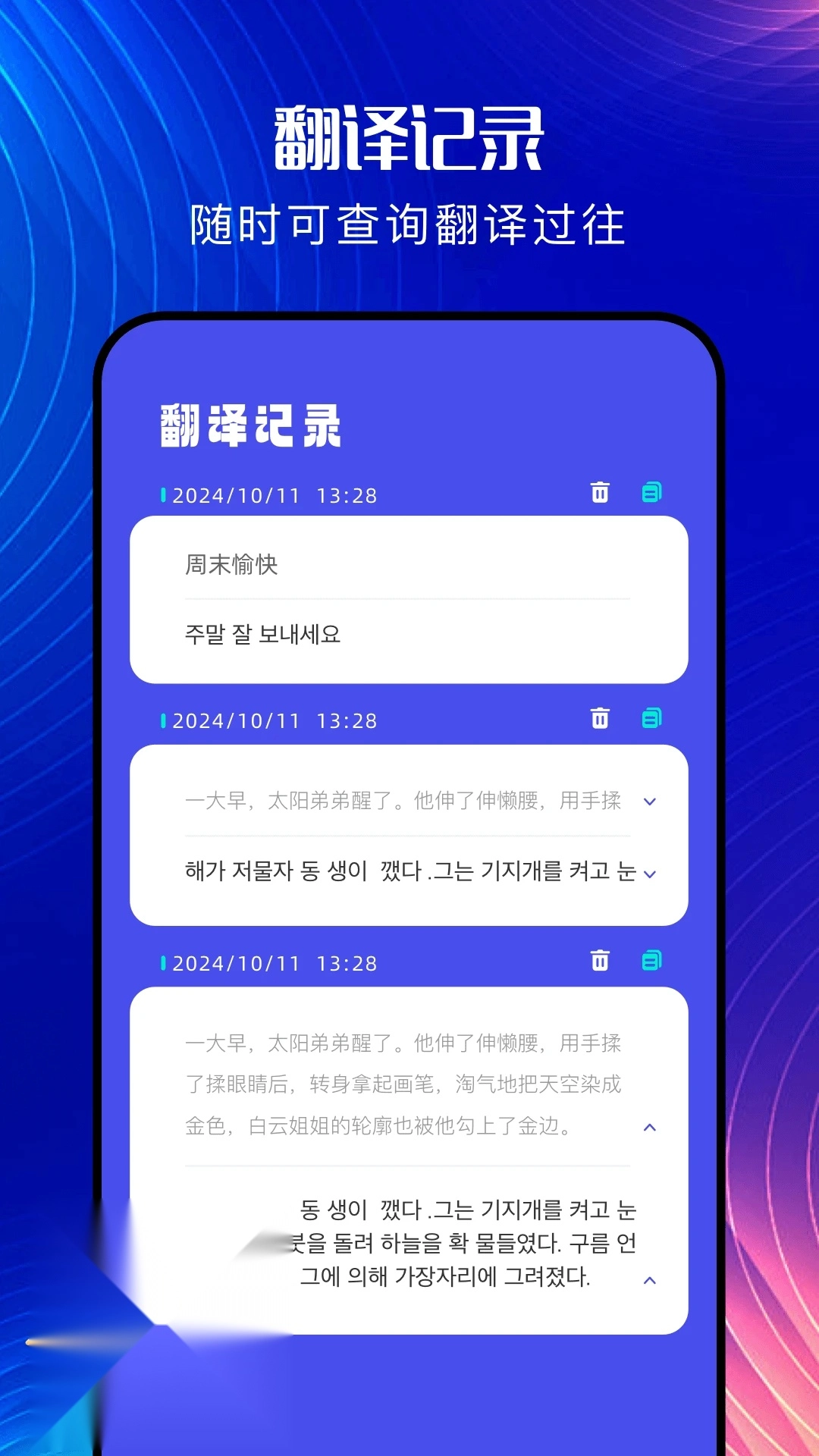 2、译记录:保留翻译实时记录,用户可根据需求随时查询和学习。