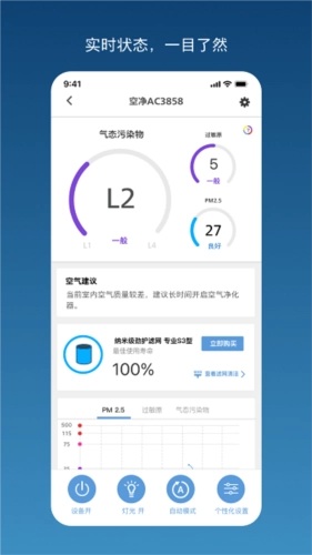 实时状态一目了然,品质家电轻松智连智慧设备,轻松操控个性场景。智能设备了解您的健康管理需求,随时随地提供精彩资讯并关爱您的健康。飞利浦智慧家软件还提供实时显示用户所在区域的天气情况,让用户快速浏览。添加设备功能让用户一键添加新的智能设备,并对商品进行了分类管理,便于查找。用户可以手动控制场景卡/快捷按钮触发,例如一键关闭所有设备离家出门。此外,还支持自动控制,在特定情况下自动触发,如室内PM2.5超过30时自动开启空气净化器。
