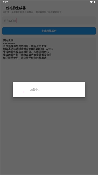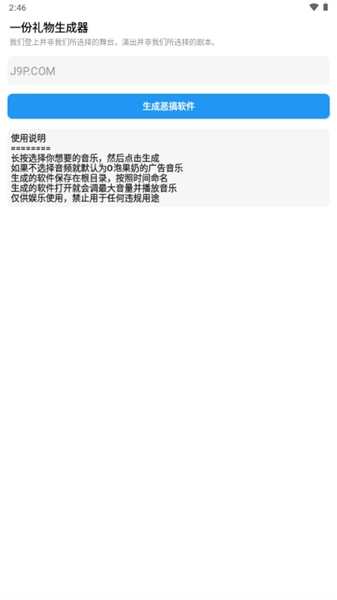 《一份礼物生成器》是一款有点搞笑又有点恶趣味的恶搞类软件。你们可以在朋友的特别的日子里,给他发过去,那么这个时候你们的朋友的手机上面就会自动播放o泡果奶等各种搞笑音乐,软件十分安全不会窃取用户信息,安装包不会报毒,可以推荐给好友开始恶搞!在这里有非常多的语音素材可以供大家选择,小伙伴们可以更好地恶搞好友,一直重复“给我o泡”的音频,非常的有趣,快来吧!