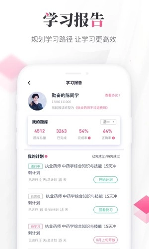 3.学习报告:全面检测学习状况,统计计划完成总量与题库练习数据