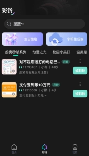 1、酷宝铃声汇聚了超多好听的来电铃声,包含各种风格和类型的铃声,满足用户的个性化需求。