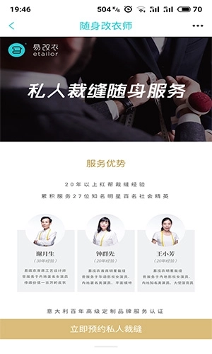 专业高品质无痕改衣,免费上门量体取衣,满足用户对合体穿着和时尚的追求。