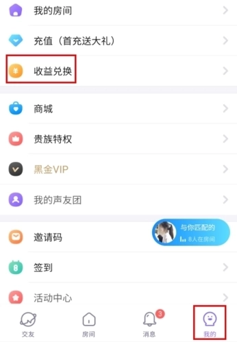 1、在我的页面中点击收益兑换按钮;