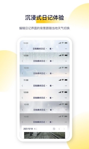 4、沉浸式日记体验:编辑日记界面的背景跟随当地天气切换。