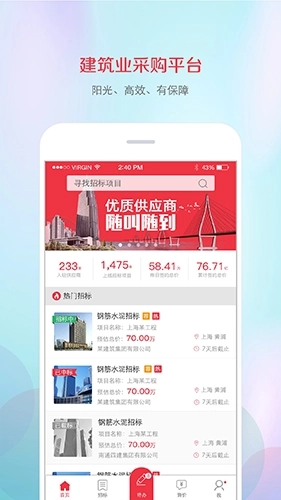 筑材网是一款集资讯发布与材料采购于一体的综合型应用软件。用户可以通过这款软件了解最新的建筑行业动态,包括政策调整、市场趋势以及技术进步等。此外,筑材网还提供了广泛的建筑材料选择,涵盖了从基础建材到高端装饰材料的各种需求。平台的一键转发功能使得用户能够轻松分享招标信息给同事或合作伙伴,而收藏功能则让用户可以随时保存感兴趣的项目信息。搜索功能使得用户可以根据关键词快速找到所需的招标资源,同时筛选功能则允许用户依据特定条件筛选出符合需求的信息。合同管理和业务统计数据查看功能进一步提升了用户的使用体验,让用户可以高效地管理自己的商业活动。