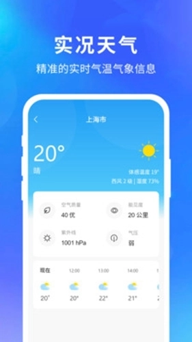 实时预报:显示当日实时的天气预报,温度、湿度、风速、气压等一一为你呈现;日落日出的时间,刮风下雨、增减衣物等提示。