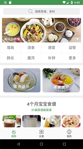 -精选各种食疗食谱,感冒中暑便秘咳嗽腹泻贫血等。全天菜单:早饭午饭晚饭。输入宝宝的出生日期精确的为宝宝推荐菜谱。