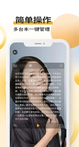 台词宝提词器是深圳市诚缘网络科技有限公司推出的短视频制作与手机提词工具,具备屏幕悬浮和透视功能,上台主持时能提供便捷的提词支持。它既是录制短视频的实用利器,又可同时启用视频录制与提词功能,尤其适合户外直播场景——用户能一边查看台词,一边灵活调动观众情绪,堪称直播必备的得力助手。