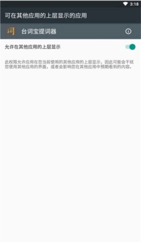 4、接着保存并启用相关设置,同时将台词宝的权限调整为允许其在其他应用的上层显示。
