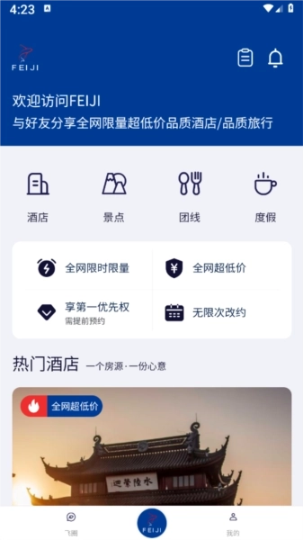 FEIJI旅行致力于为广大用户提供超低价的酒店客房与景点门票服务。我们始终专注于一件事——为用户带来高品质的酒店体验和优质的旅行服务。
