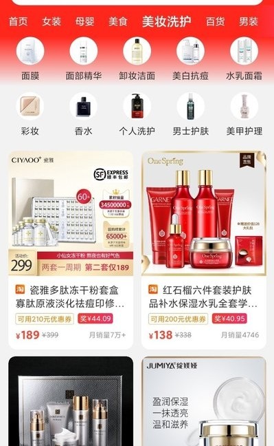 2、精品分类,服装、美食食品、美妆、母婴等一目了然的分类,购物方便又自由。