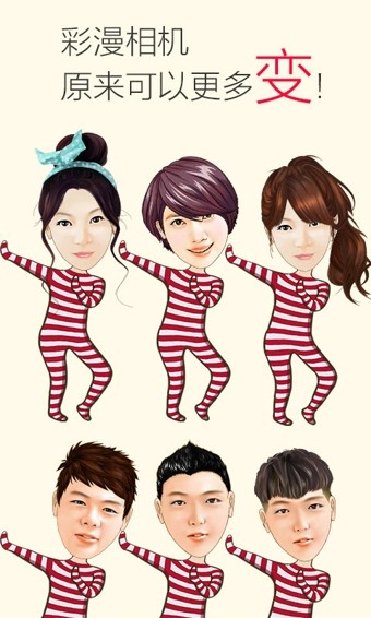 4、自动人脸检测:自拍照、人物照、合照……有了彩漫相机,那都不是事儿,只要一键,自动定位五官,自动检测最适合的发型、脸型和背景。彩漫相机--最智能的彩色DIY相机。
