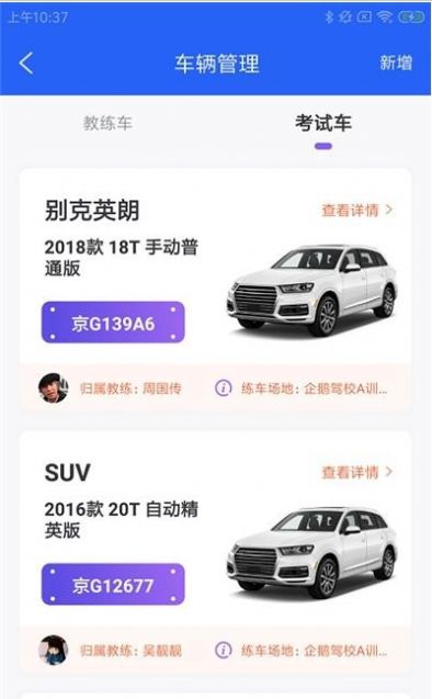 2、可以快速查看驾校各个教练的信息和通过率,软件还详细记录了每辆车的管理人员。