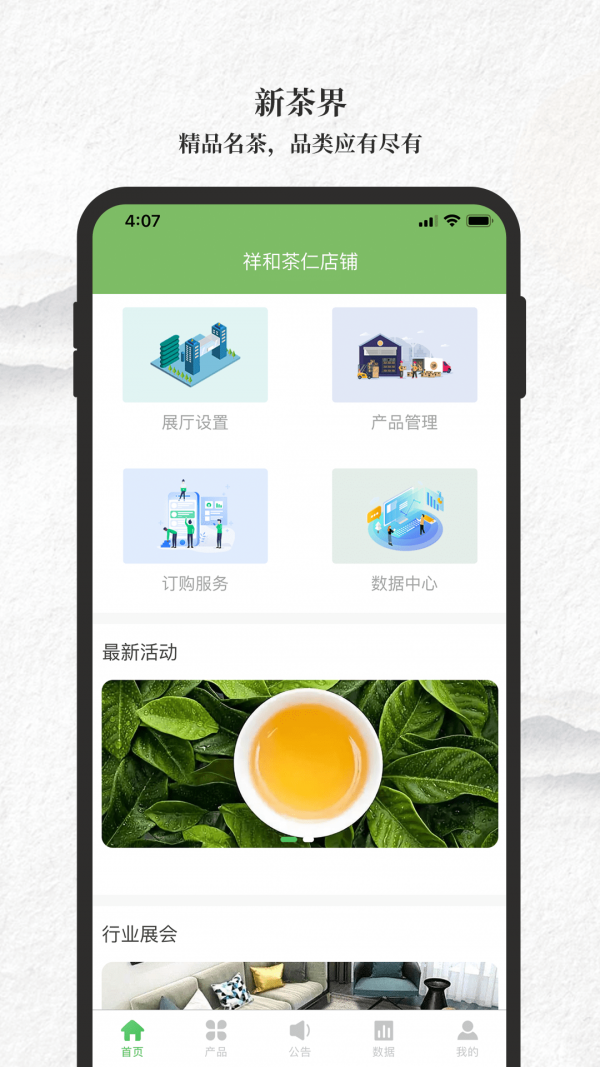 3、新茶界商家版APP为商家提供方便的展厅店铺管理、产品管理、智能数据分析等。