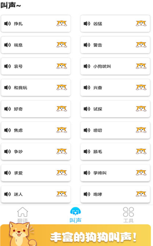 可爱猫狗翻译器:专业的宠物翻译工具,用户可以通过这个软件来翻译出宠物猫和狗的叫声所蕴含的信息,齐全的叫声模板在线即可观看,点击语音工具即可实时为你大致翻译,首页上还有最新的养宠的最新资讯和文章,最新的技术提供给你,丰富的狗狗叫声在线收听,使用起来是很简单的,轻轻松松即可一键翻译,喜欢的话就来下载吧。