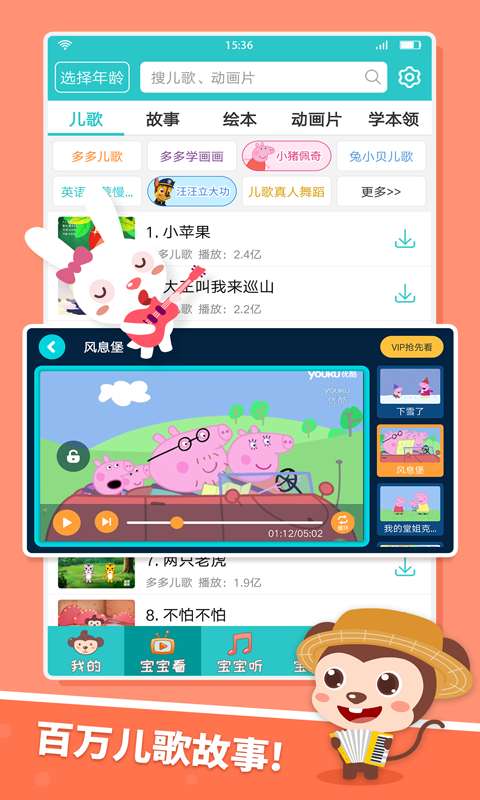 3、百万儿歌故事、动画绘本、儿童游戏、早教童谣、亲子游戏……更多优选内容给孩子一个快乐的童年。